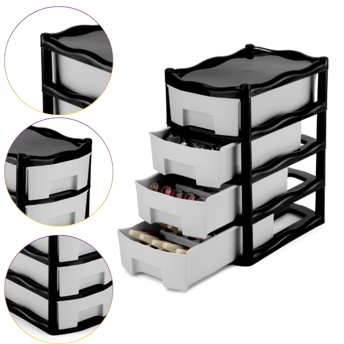 Gaveteiro Retangular Médio 4 Gavetas Preto — compacto, durável e versátil. A escolha ideal para manter seus itens e ferramentas sempre organizados com praticidade e estilo!