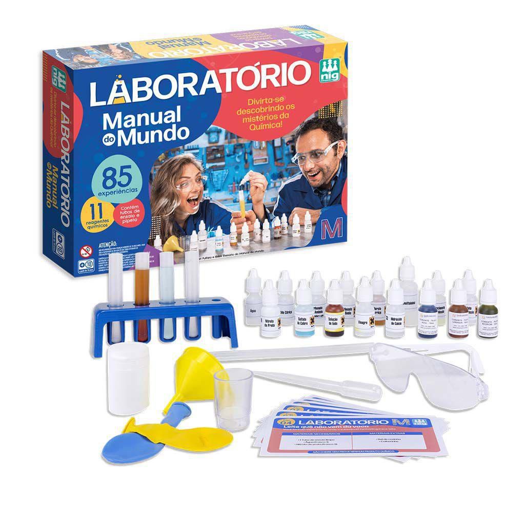 Número de Participantes: 1 ou mais jogadores Conteúdo da Embalagem: 01 Manual, 85 Fichas de Experiências, 01 Conta-Gotas (pipeta), 02 Canudos Plásticos, 02 Bexigas, 04 Tubos de Ensaio, 01 Estante para Tubos de Ensaio, 01 Funil, 11 Frascos com Reagentes Químicos, 02 Frascos Vazios, 03 Corantes Coloridos, 01 Óculos de Segurança, 01 Copinho Plástico e 01 Potinho Plástico com Tampa. Composição: Polipropileno, Poliestireno, EVA, Balão de Látex, Soluções Químicas e Papel.