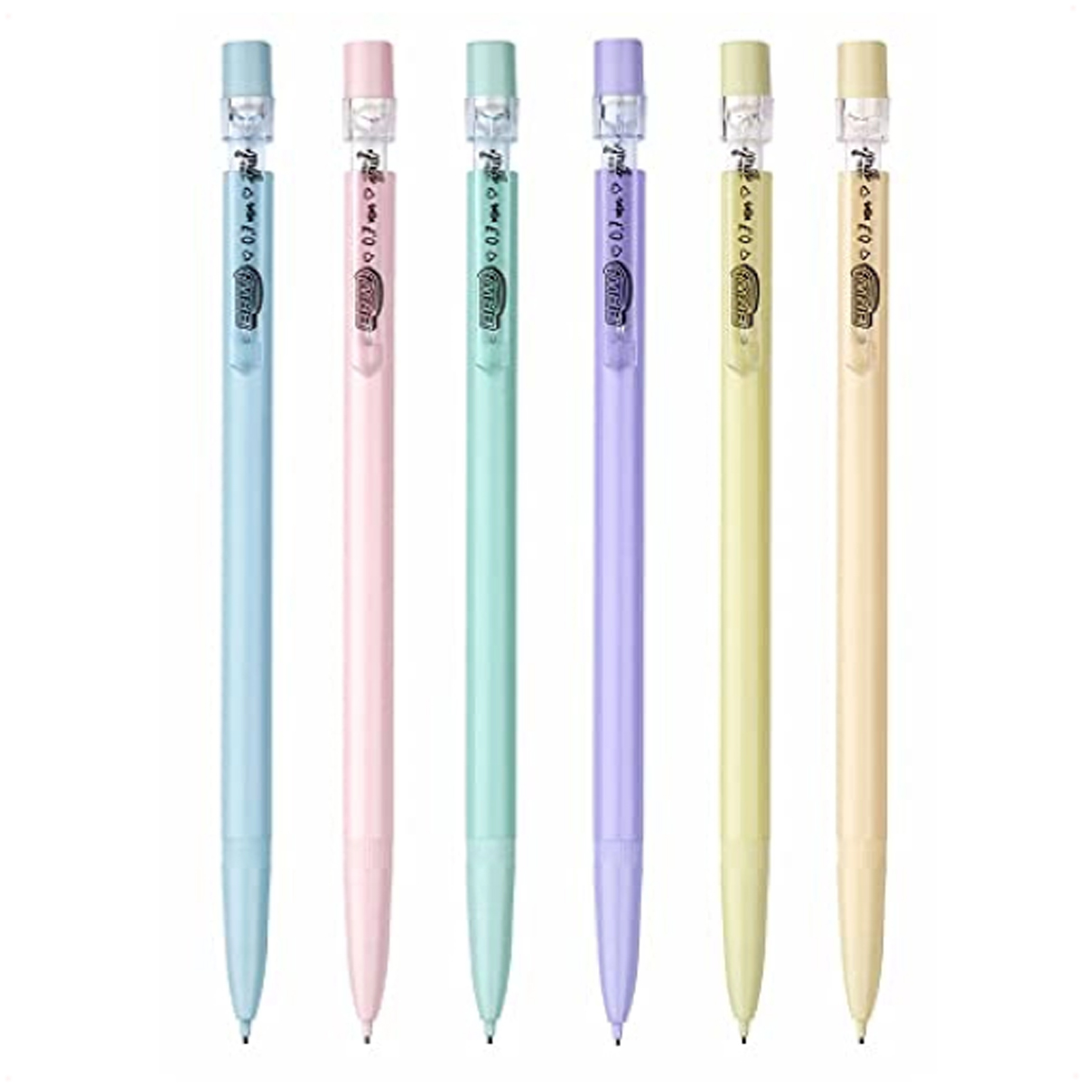 Lapiseira plástica 0.7mm disponível em 6 cores pastéis: amarelo, rosa, laranja, lilás, verde e azul. Feitas de plástico resistente e com mecanismo de qualidade. Para o avanço de carga, dispõe de mecanismo preciso. Possui borracha com tampa.