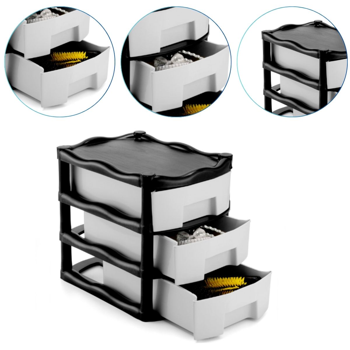 Fabricado em plástico de alta qualidade, o gaveteiro oferece durabilidade e fácil manutenção, além de três amplas gavetas que permitem o armazenamento organizado de diferentes tipos de objetos. Seu acabamento na cor preta garante um visual elegante e discreto, combinando facilmente com qualquer ambiente.