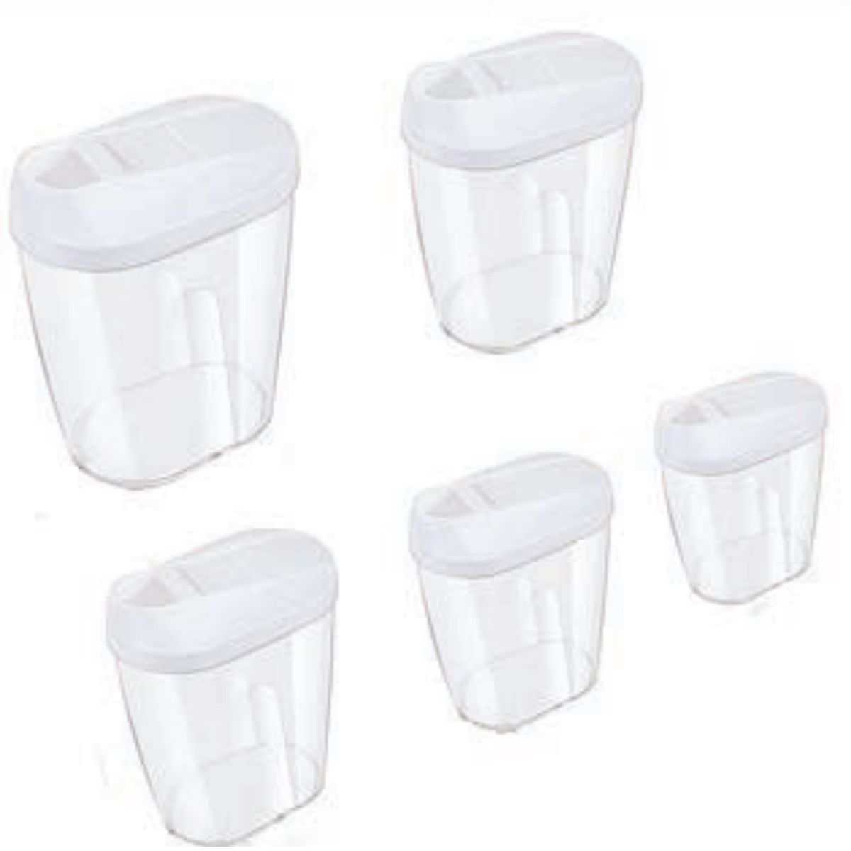 Conjunto com 5 potes para armazenamento de alimentos, pestiscos, doces etc. com 5 tamanhos diferentes para melhor armazenamento. A tampa com o bico prático ajuda na hora de servir as doses desejadas.
