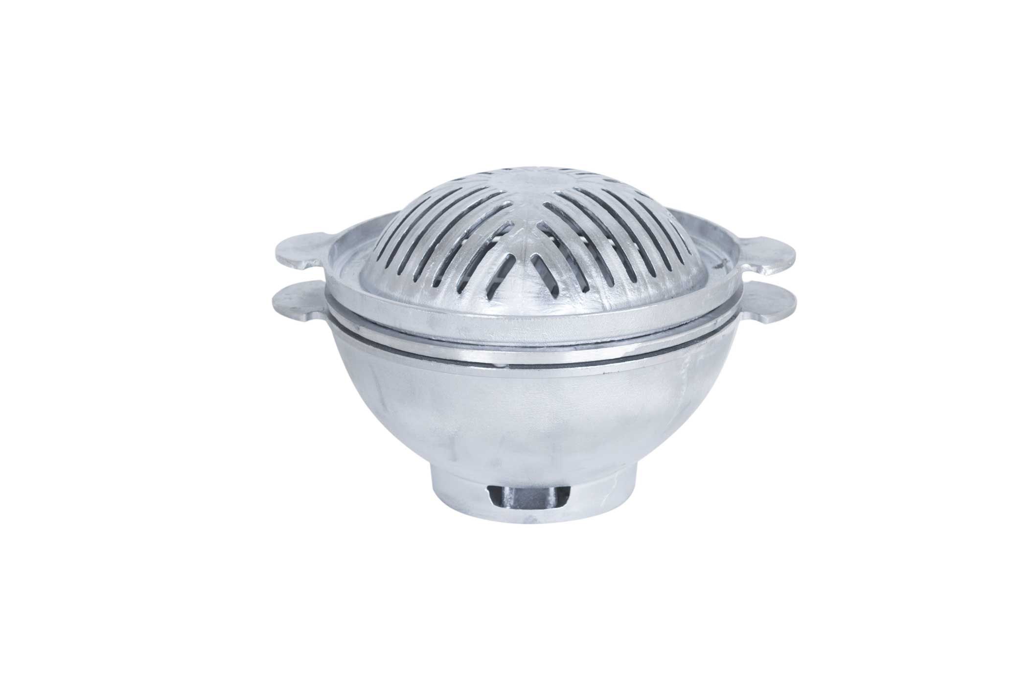 Contem duas chapas: Uma reta para carne com ossos, espetinho, linguiça etc. e outra abaulada para bife