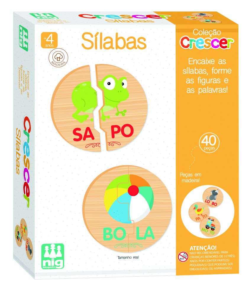 Nesse jogo a criança vai encaixar as peças e formar palavras com duas sílabas. Desenvolve a consciência fonológica e a percepção visual. São 40 peças grandes em madeira (8,5 x 8,5 cm montadas) com encaixes diferentes e ilustrações para guiar a criança.