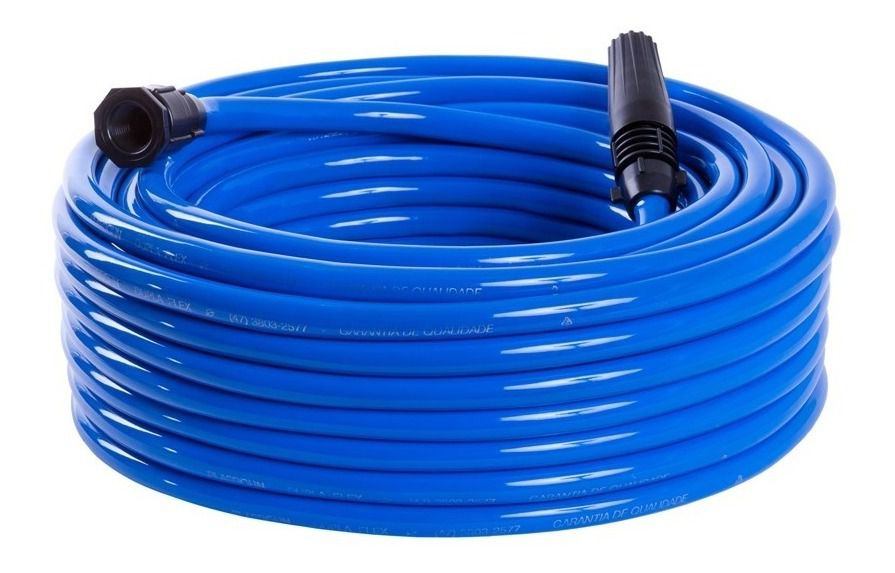 Fabricada com duas camadas de PVC flexível, acompanhada esguicho com adaptador regulável para torneiras de ½” e ¾” e terminais roscáveis.
