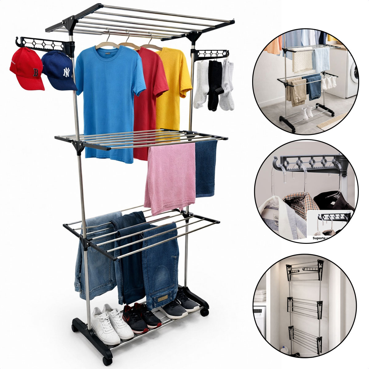 Transforme sua lavanderia com o varal vertical dobrável que une eficiência, mobilidade e durabilidade. Feito de aço inox resistente à ferrugem, com 3 prateleiras ajustáveis espaçosas (suporta até 10kg), ideal para secar roupas, sapatos e acessórios sem amassar.